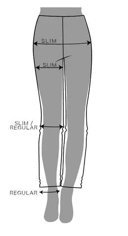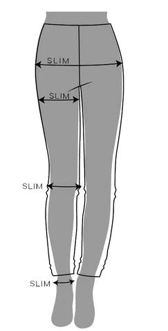 Slim-istuvuus seuraa kehon muotoa ja on malliltaan kapea alas asti. Slim-housut ovat nilkoista leveämmät kuin Skinny-malleissa.
