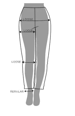 Relaxed-istuvuus on samanlainen kuin Regular, mutta se on löysempi vyötäröltä jalkaan ja siinä on joustava vyötärö.