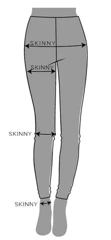 Skinny on valikoiman tiukin malli. Skinny-housut antavat tiukasti istuvan ilmeen vyötäröstä nilkkaan.